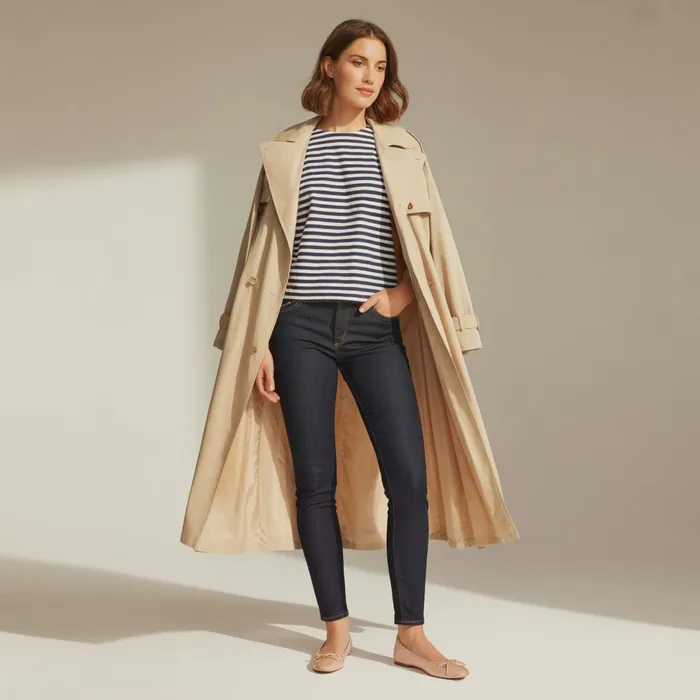 • Parisian casual: Light trench , striped Breton top , slim jeans & ballet flats