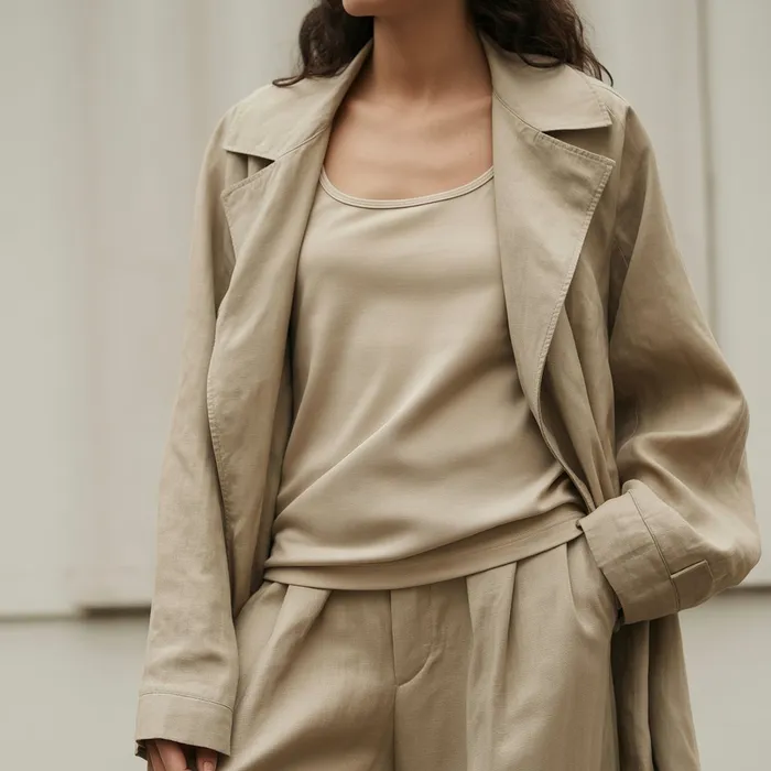 • Monochrome minimalism: Beige trench , beige sweater & beige pants